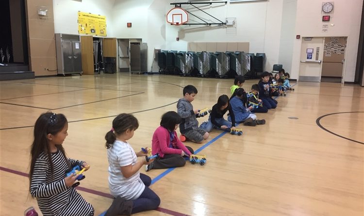 まず一年生は、「じどう車ずかん」の発表。二年生は、単元「しかけカード」の作り方の手順を用いて「ゴムで動く車」の説明書を仕上げ紹介。